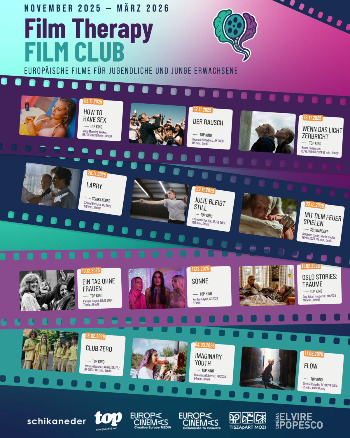 Der Film Therapy FILM CLUB ist ein Angebot für die junge Generation, aber auch für deren Lehrer/innen und (in getrennten Screenings) Eltern, sich in einer Auseinandersetzung mit europäischen Filmen spezifischen Themen und Problemen, die gerade junge Menschen besonders beschäftigen und herausfordern, anzunähern und konstruktiv mit Expert/innen zu besprechen.