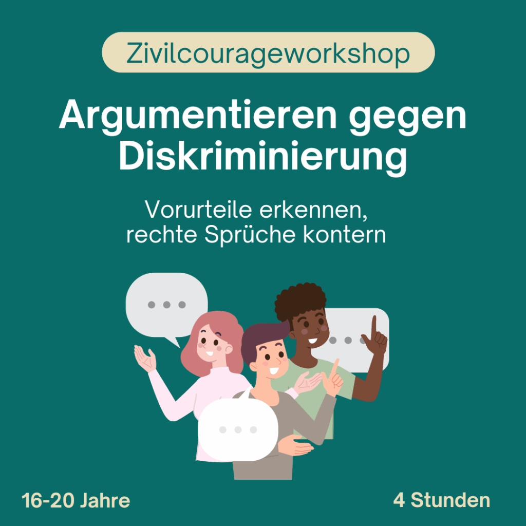 Ziel des Workshops ist die Erwei­te­rung der eigenen Reak­ti­ons­mög­lich­kei­ten bei ras­sis­ti­schen und dis­kri­mi­nie­ren­den Vorfällen, ein gestärk­tes Selbst­ver­trau­en für zivil­cou­ra­gier­tes Handeln sowie eine stärkere Resilienz gegenüber Vor­ur­tei­len und rechter Rhetorik.