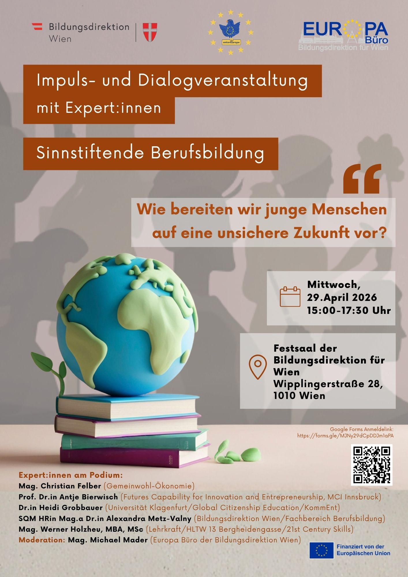 Das Europa Büro der Bildungsdirektion für Wien lädt am Mittwoch, 29. April 2026 ab 15:00 Uhr im Rahmen des Erasmus+ Projekts „Sinnstiftende Berufsbildung“ zu einer Impuls- und Dialogveranstaltung ein, die sich der Frage widmet, wie junge Menschen in einer von Unsicherheit, Krisen und Wandel geprägten Welt gut begleitet werden können. Die Veranstaltung richtet sich an alle Lehrkräfte, mit besonderem Fokus auf die Berufsbildung.