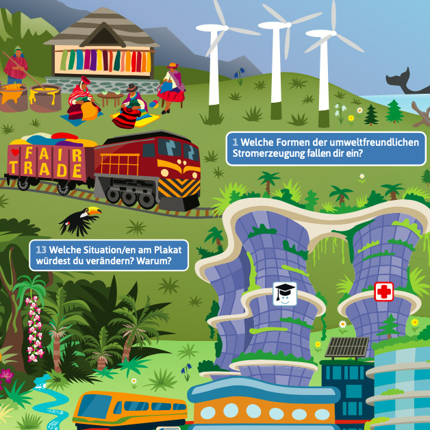 Die Übung eignet sich als erste Auseinandersetzung mit den SDGs und vermittelt einen Eindruck über das in der Klasse vorhandene Vorwissen zum Thema. Im Vordergrund stehen Fragen, die in Zusammenhang mit Nachhaltigkeit und globalen Herausforderungen stehen. Die auf dem Plakat abgebildeten Situationen geben Hinweise auf mögliche Antworten, werden aber nicht weiter thematisiert. Die Lernenden tauschen sich in Kleingruppen aus und überlegen gemeinsam eine (kreative) Form der Präsentation.