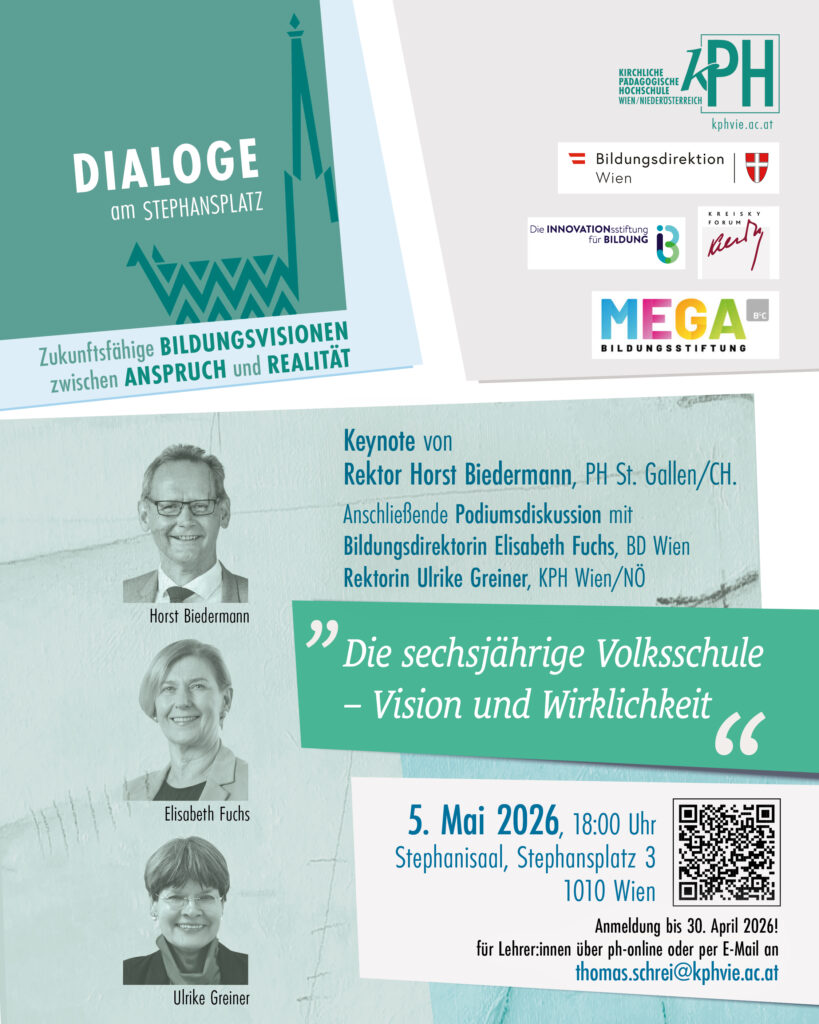 Die Ver­an­stal­tung bringt Per­spek­ti­ven aus Wis­sen­schaft, Bil­dungs­po­li­tik und Praxis zusammen. Im Mit­tel­punkt steht eine Keynote von Rektor Horst Bie­der­mann (PH St. Gallen/​CH). Anschlie­ßend dis­ku­tie­ren Bil­dungs­di­rek­to­rin Elisabeth Fuchs (BD Wien) und Rektorin Ulrike Greiner (KPH Wien/​NÖ) im Rahmen einer Podi­ums­dis­kus­si­on zentrale Fragen zur Wei­ter­ent­wick­lung des Bildungssystems.
