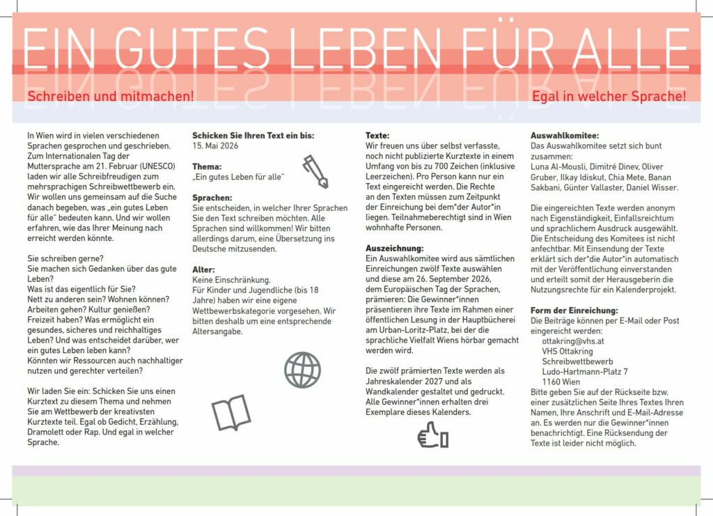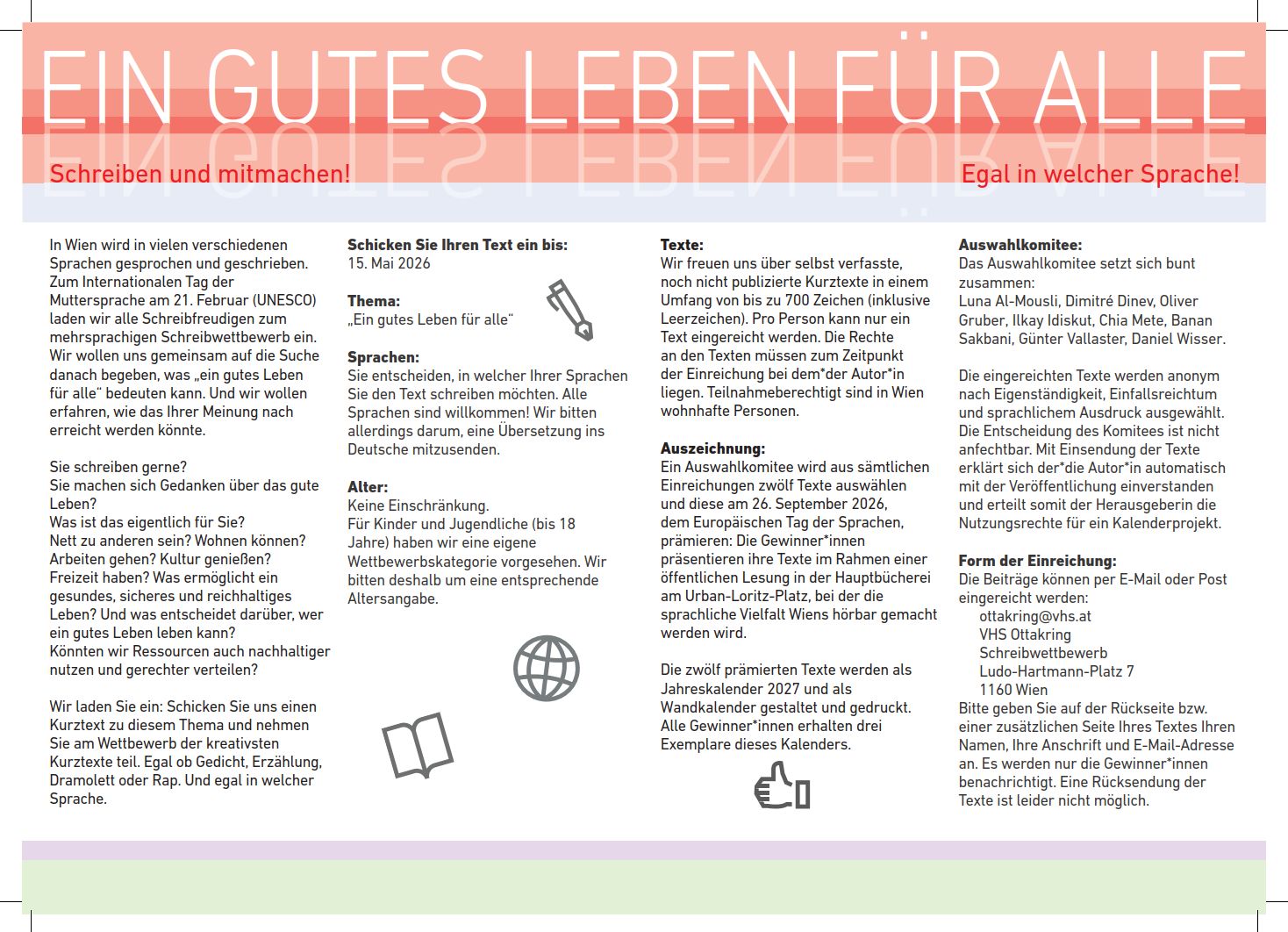 Die Stadt Wien Büchereien suchen gemeinsam mit der Arbeiterkammer Wien, der VHS Ottakring und der Bezirksvorstehung Ottakring die kreativsten Kurztexte zum Thema „Ein gutes Leben für alle“. Egal ob Gedicht, Mini-Dialog, Rezept, Werbetext, Kurzgeschichte oder Rap. Und egal in welcher Sprache! Wir bitten darum, eine Übersetzung ins Deutsche mitzusenden.