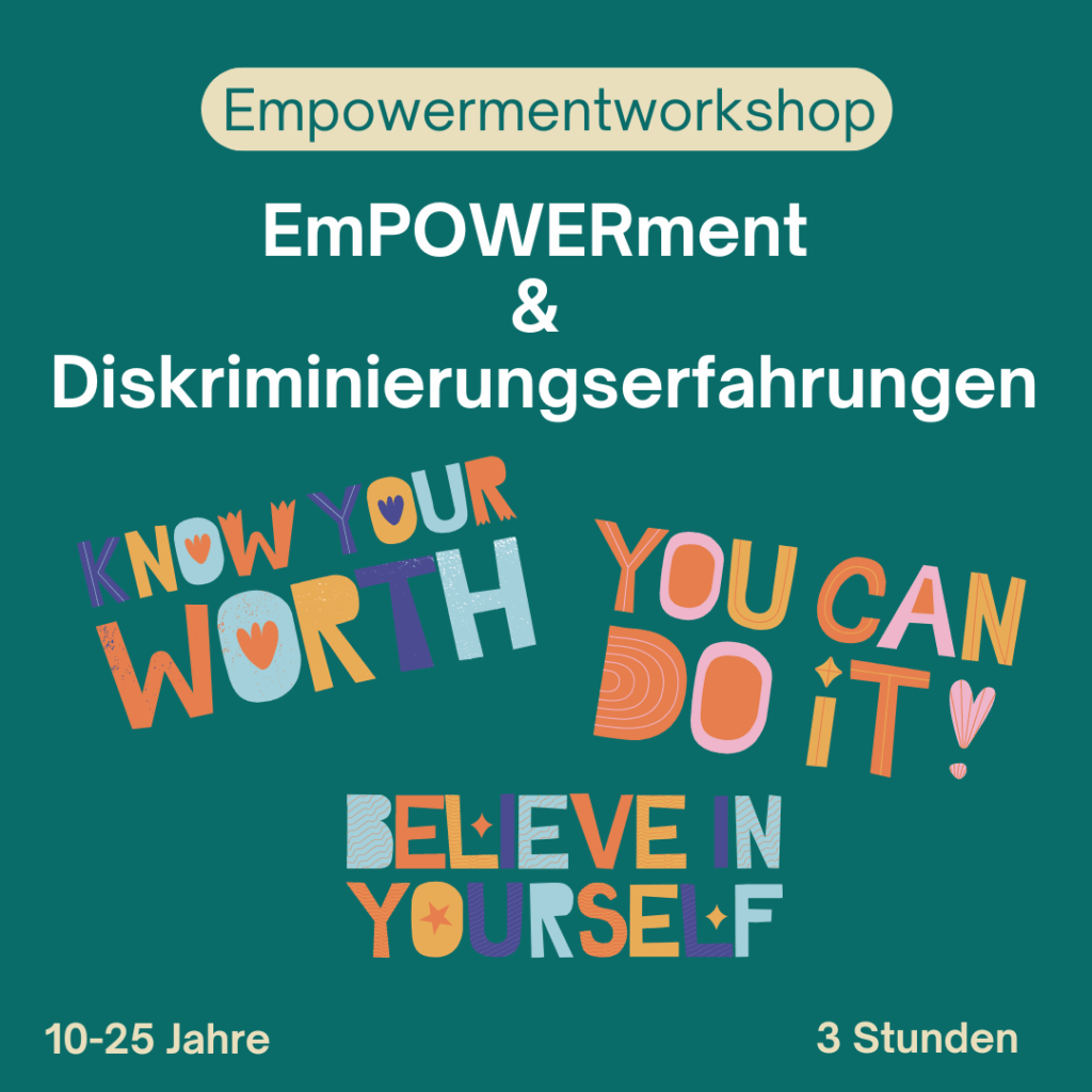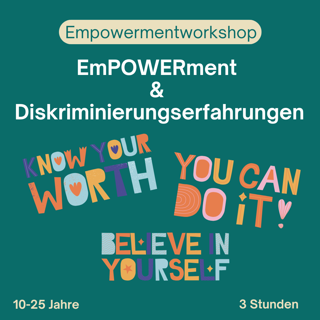 „EmPOWER­ment und Dis­kri­mi­nie­rungs­er­fah­run­gen“ beschäf­tigt sich damit, wie Kinder und Jugend­li­che durch Empower­ment gestärkt werden können, um Dis­kri­mi­nie­rungs­er­fah­run­gen zu bewäl­ti­gen. Der Workshop setzt sich aus einem theo­re­ti­schen Teil, indem die Teil­neh­men­den all­ge­mei­ne Begriff­lich­kei­ten rund um das Thema Dis­kri­mi­nie­rung erfahren und einem über­wie­gend inter­ak­ti­ven Teil, in dem es Raum für Austausch und Selbst­er­fah­rung gibt, zusammen. Die Teilnehmer/​innen bekommen die Mög­lich­keit, zu erfahren Grenzen bewusst zu setzen und (dis­kri­mi­nie­ren­de) Gewalt ihnen gegenüber zu erkennen und zu kommunizieren.