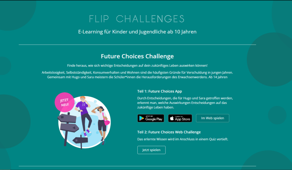 Die FLiP Chal­lenges bieten eine der Zeit ent­spre­chen­de inno­va­ti­ve Bildung – spie­le­risch und digital. In einem vir­tu­el­len Klas­sen­zim­mer können Pädagog*innen die Finanz­kom­pe­tenz ihrer Schul­klas­se ermitteln und die Per­for­mance der Schüler*innen verfolgen. Die Financial Life Challenge besteht aus vier Modulen, die sich an den Wis­sens­sta­tio­nen des FLiP ori­en­tie­ren. Die Inhalte einer FLiP Tour können mit dieser Challenge in rund einer Stunde online erlebt werden. Die Invest­ment Challenge bietet gami­fi­zier­tes Lernen zum Thema Vorsorge am Kapi­tal­markt. Aufgrund der aktuellen Zins- und Infla­ti­ons­la­ge ist das Sparen am Kapi­tal­markt eine sinnvolle Alter­na­ti­ve zum klas­si­schen Sparbuch. Wie man mit Krea­ti­vi­tät und Ein­füh­lungs­ver­mö­gen die Welt ein Stück besser machen kann, lernen Kinder und Jugend­li­che mit der FLiP Entre­pre­neur­ship Challenge. Anhand der Inno­va­ti­ons­me­tho­de „Design Thinking“ sammeln die Spieler*innen Erfah­run­gen im unter­neh­me­ri­schen Denken. In der Future Choices Challenge begleiten die Spieler*innen die Cha­rak­te­re Hugo und Sara auf ihrem Weg ins Erwach­se­nen­le­ben, treffen für sie Ent­schei­dun­gen und lernen, wie sehr sich diese auf das ganze Leben auswirken können.