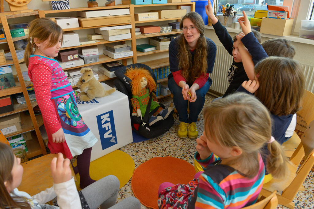 Mit den Handpuppen „HELMI“ und „Julia“ und einen Kindersitz erklärt eine KFV-Mitarbeiterin bzw. ein KFV-Mitarbeiter alles rund um das Thema „Kindersitz“ und „Sicherheit im Auto“. HELMI und Julia zeigen, wie man sich richtig anschnallt und wie der Sitz richtig eingestellt werden muss, damit er in Gefahrensituationen auch richtig funktioniert. Die Kinder können dies dann auch gleich selbst ausprobieren und sich mit Hilfe der KFV-Mitarbeiterin bzw. des KFV-MItarbeiters in den Kindersitz setzen und richtig anschnallen lassen.