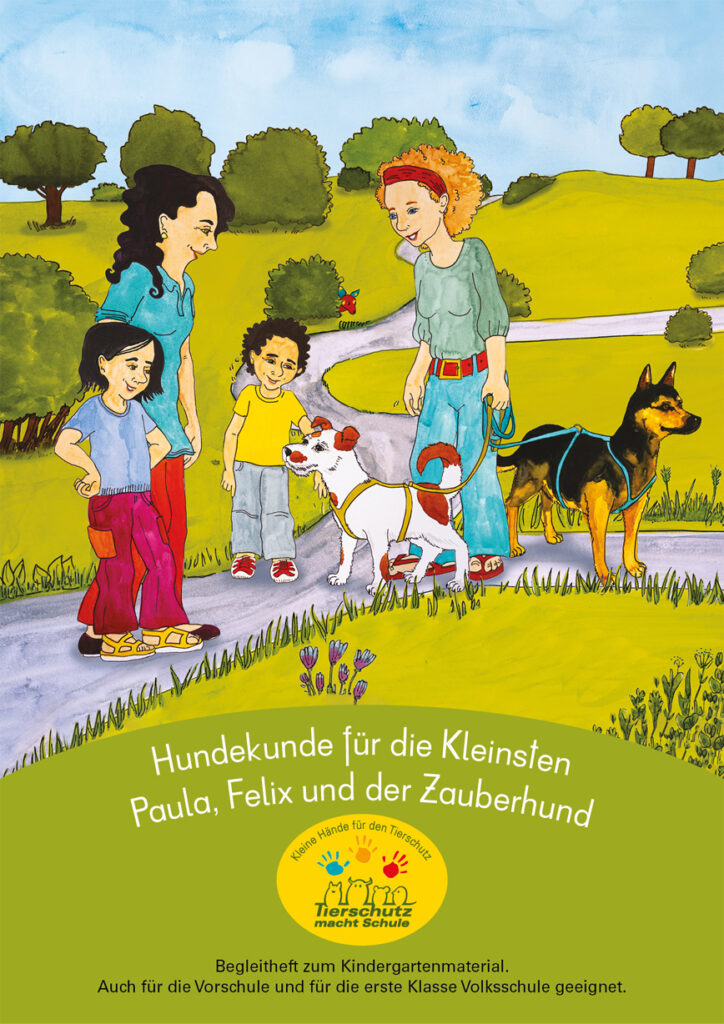 Erstes Wissen über Hunde und den sicheren Umgang mit ihnen vermittelt das Material „Hundekunde für die Kleinsten: Paula, Felix und der Zauberhund“ vom Verein „Tierschutz macht Schule“. Mithilfe der Kamishibai-Geschichte und den Bildkarten können die Kinder die Körpersprache der Hunde besser verstehen, was im Alltag für alle Kinder hilfreich ist. Dazu gibt es ein Wandposter, Zwei-und zwei Spielkarten, ein Hundelied und vieles mehr. Zielgruppen: 1. Schulstufe sowie für Kinder mit Deutschförderbedarf, da das Material viele Sprechanlässe bietet. Das Material kann kostenlos, exkl. Versand, bestellt werden.