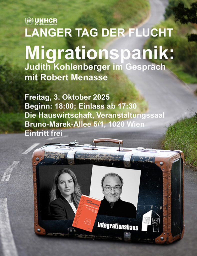 Zum Langen Tags der Flucht am 03. Oktober 2025 veranstaltet das Integrationshaus eine Lesung und Gespräch mit der Migrationsforscherin und Integrationshaus-Vorstandsmitglied Judith Kohlenberger und dem Schriftsteller und politischer Essayisten Robert Menasse.