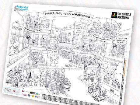 Zu sehen sind Menschen in der Stadt beim Reparieren, Upcycling, Tauschen, Teilen und Secondhandkauf. Das Poster stellt Möglichkeiten vor, wie Gegenstände möglichst lange genutzt werden können. Auf dem Bild wimmelt es nur so von Ideen, damit nichts verschwendet wird – vom Repaircafé bis zum offenen Schrank für Tauschgegenstände. Das motiviert zu Aktivitäten, zum Beispiel einfach mit Buntstiften das Bild auszumalen oder sogar gemeinsam mit anderen eine Initiative im Grätzel zu starten.