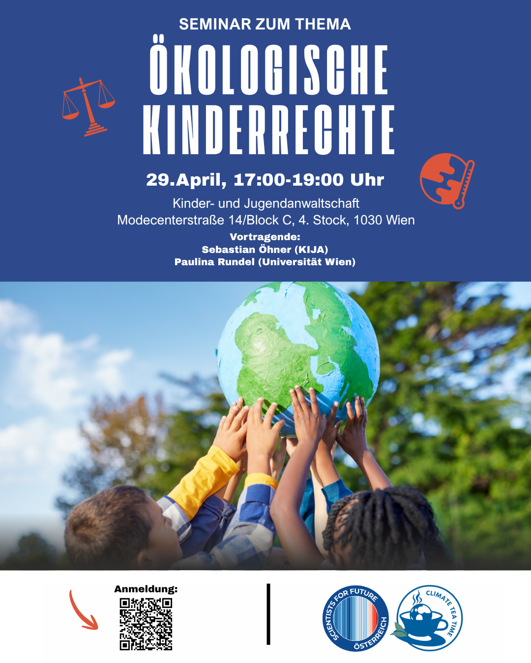Am 29. April 2026 von 17:00 bis 19:00 Uhr ver­an­stal­tet das Netzwerk Climate Tea Time in Koope­ra­ti­on mit Scientists4Future in der Kinder- und Jugend­an­walt­schaft (KIJA, Mode­cen­ter­stra­ße 14/​Block C, 4. Stock, 1030 Wien) ein Seminar zum Thema „Öko­lo­gi­sche Kin­der­rech­te“. Das Programm gestaltet sich wie folgt: