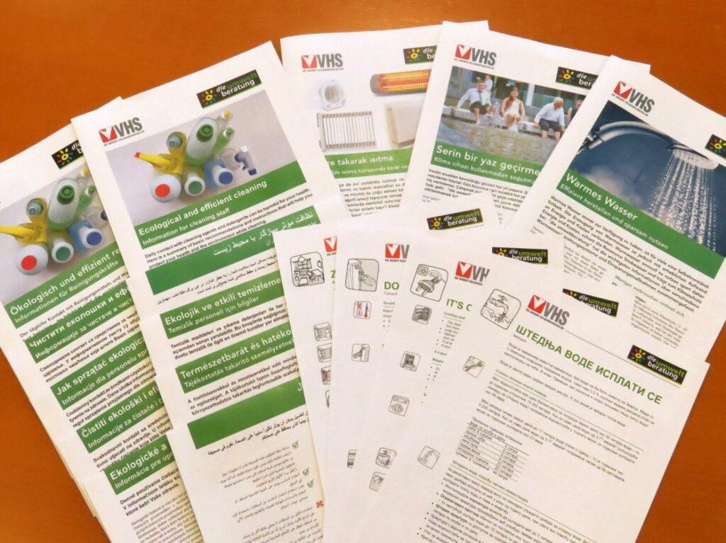 Ökologisches Handeln im Alltag braucht Information und Anregungen. Um möglichst vielen Menschen Informationen über ökologisches Handeln zugänglich zu machen, hat DIE UMWELTBERATUNG einige Infomaterialien in verschiedene Sprachen übersetzen lassen. •Energie-Spartipps zu Strom, Heizen, Warmwasser und gesund Wohnen – Arabisch, Bosnisch-Kroatisch, Deutsch, Englisch, Serbisch, Türkisch •Ökotipps zu Stromheizung, Warmwasser, sommerliche Überwärmung – Deutsch, Türkisch •Ökologisch und effizient reinigen – Arabisch, Bosnisch-Kroatisch, Englisch, Deutsch, Farsi, Polnisch, Serbisch, Slowakisch, Türkisch, Ungarisch