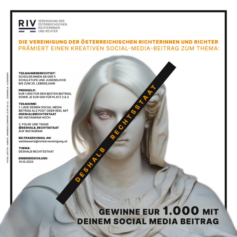 Die Vereinigung der österreichischen Richterinnen und Richter veranstaltet einen Wettbewerb, bei dem die kreativsten Social-Media-Beiträge mit dem Titel „Deshalb Rechtsstaat“ prämiert werden. Der Wettbewerb soll dazu beitragen, dass junge Menschen sich mit den Themen „Rechtsstaat“ und „Demokratie“ beschäftigen und Inhalte gestalten, die die Bedeutung dieser Grundwerte für ein friedliches Zusammenleben hervorheben.