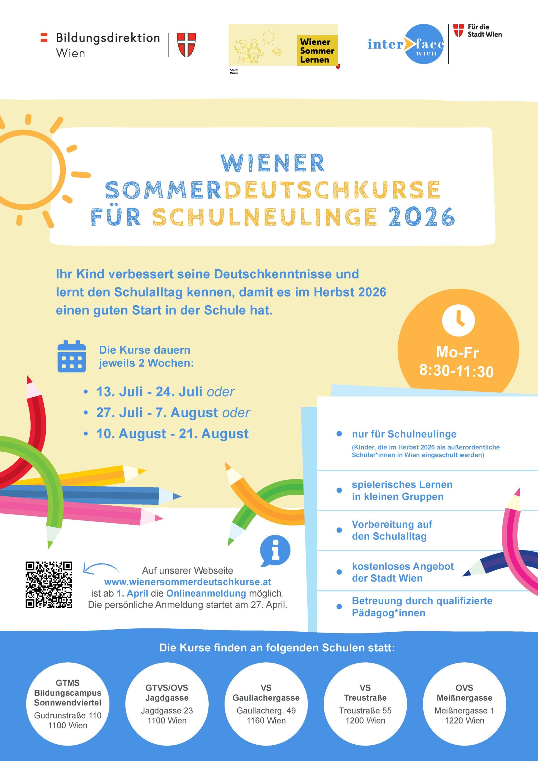 Die Kurse finden im Zeitraum von 13. Juli bis 21. August an 5 Schulstandorten in verschiedenen Wiener Bezirken statt und dauern jeweils zwei Wochen. Jede Gruppe mit maximal 12 Kindern wird dabei von erfahrenen Sprachlehrer/innen begleitet. Die Kinder üben Deutsch beim Spielen und in alltäglichen Situationen. Ziel ist, sie besonders gut auf den Start in die Schule vorzubereiten.