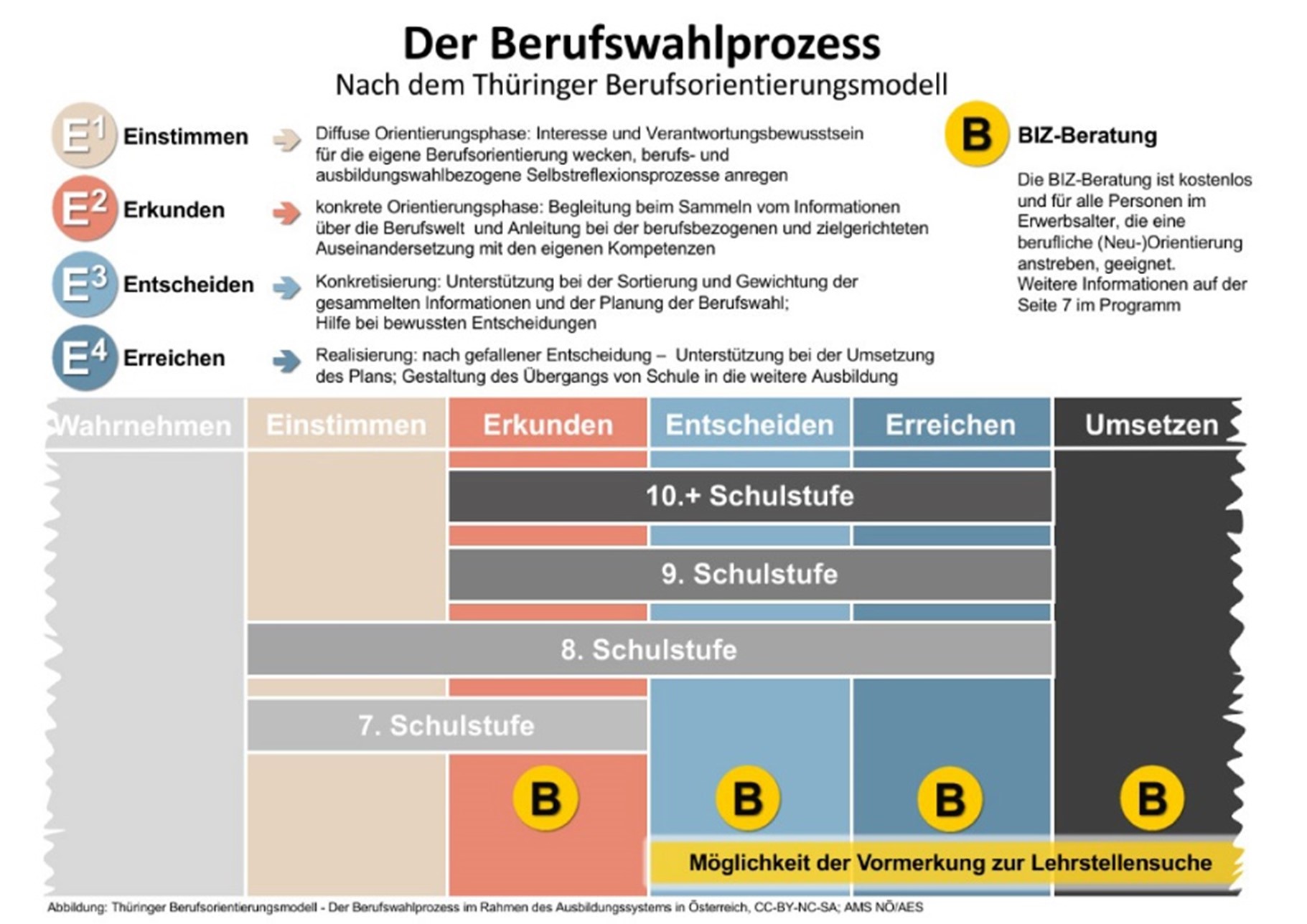 Unterstützung bei der Berufs- und Ausbildungswahl, insbesondere bei der Entscheidung: Schule oder Lehre; Besprechung der Aufnahmebedingungen an Schulen; Unterschiede von BHS-Matura, AHS-Matura und Lehre mit Matura