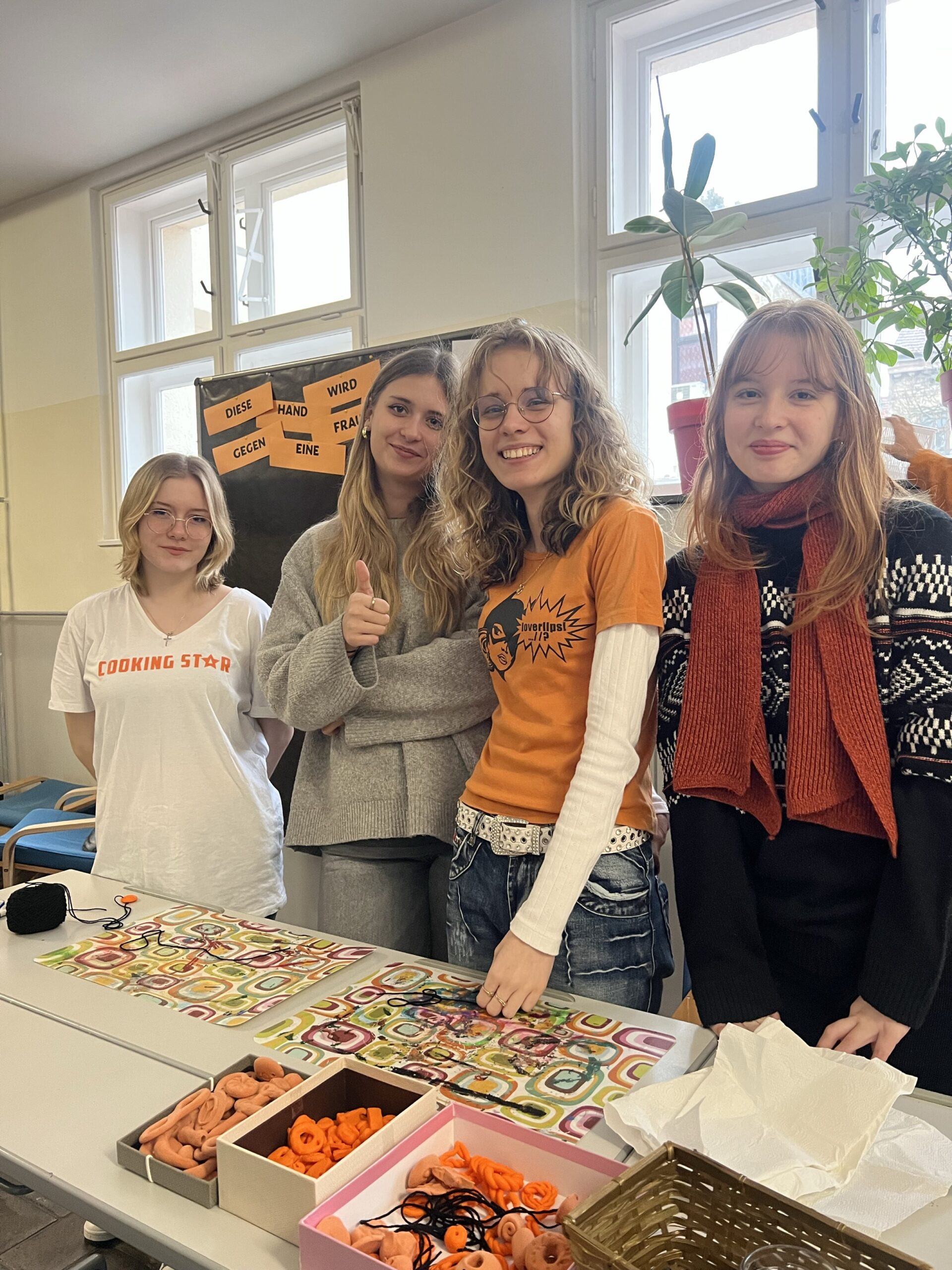 - Alle Lehrer/innen und alle Schüler/innen wurden bei unseren drei großen Aktionen auf Geschlechtergerechtigkeit aufmerksam gemacht und konnten einen Beitrag leisten. – Jede Aktion ist von Wissensvermittlung und Information begleitet und regt auch Aktivitäten im Unterricht an, z.B. werden Referate über Frauenrechte gehalten, Steckbriefe herausragender Frauen erstellt, Klassenlektüren mit Mädchen und Frauen als Hauptfiguren gelesen, Statistiken und Zahlen über Frauenanteile oder Femizide plakatiert. – Wir haben die Chance, Frauensolidarität zu erleben, was besonders bei den Aktionen in der Schule spürbar ist. – Wir machen sichtbar, dass die Idee einer einzelnen Schülerin etwas nachhaltig an der Schule verändern kann. Jovana wurde am Schulschluss 2024 mit einer Urkunde für ihr Engagement geehrt. – Wir alle lernen, dass wir nicht handlungsunfähig sind!